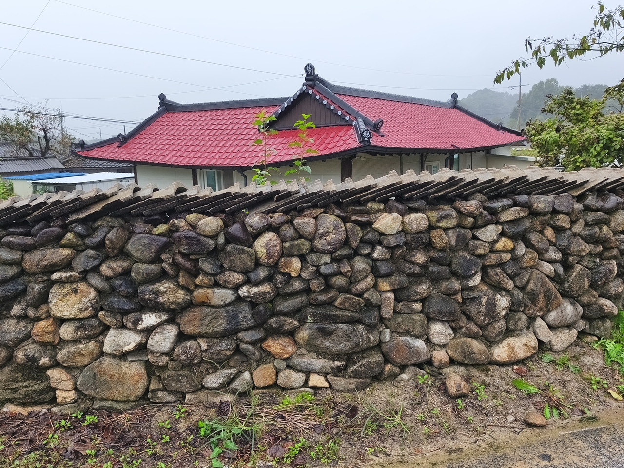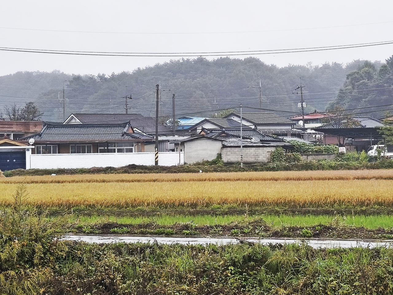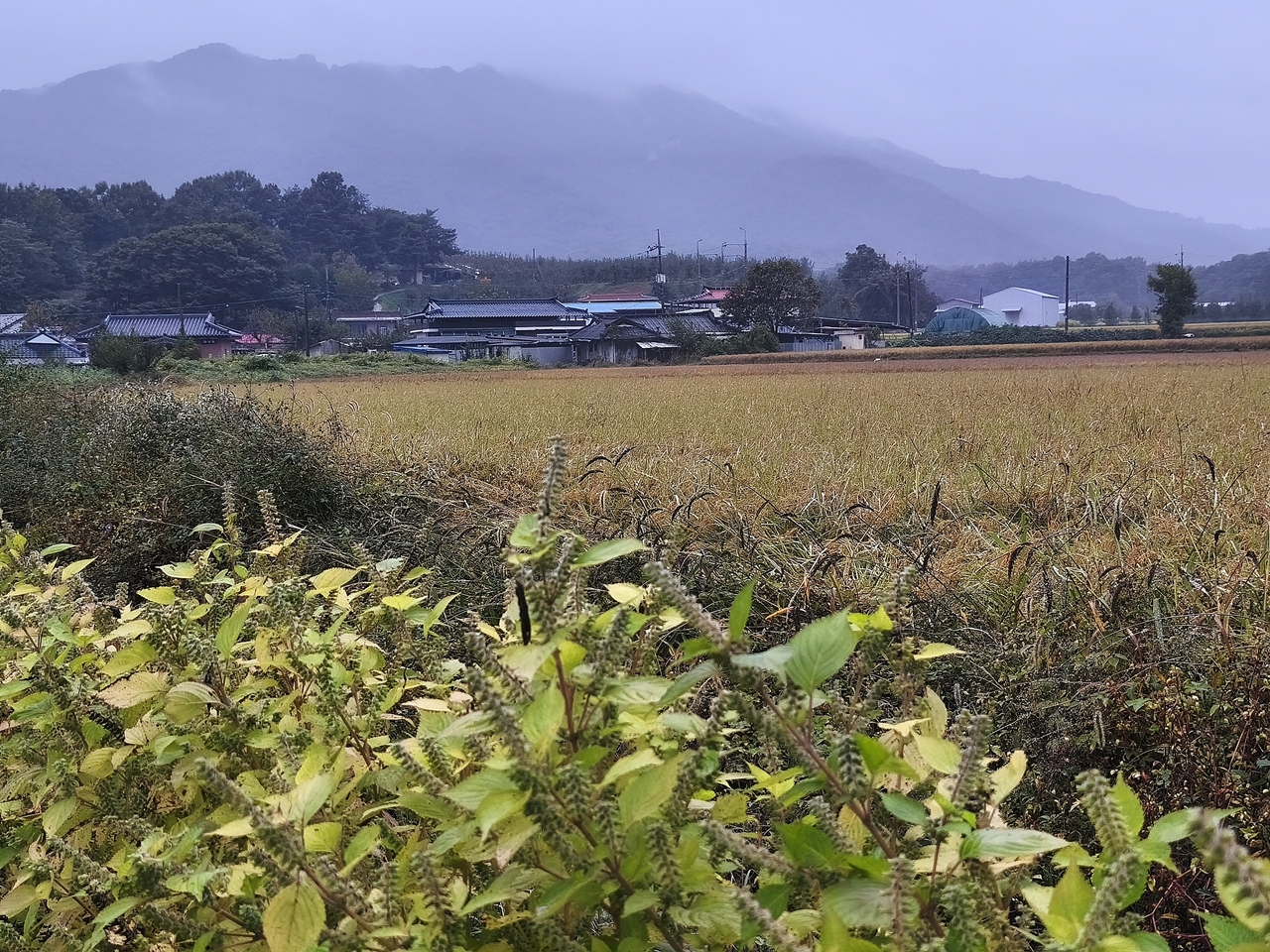 비 내리는 안개 속에 마을 풍경