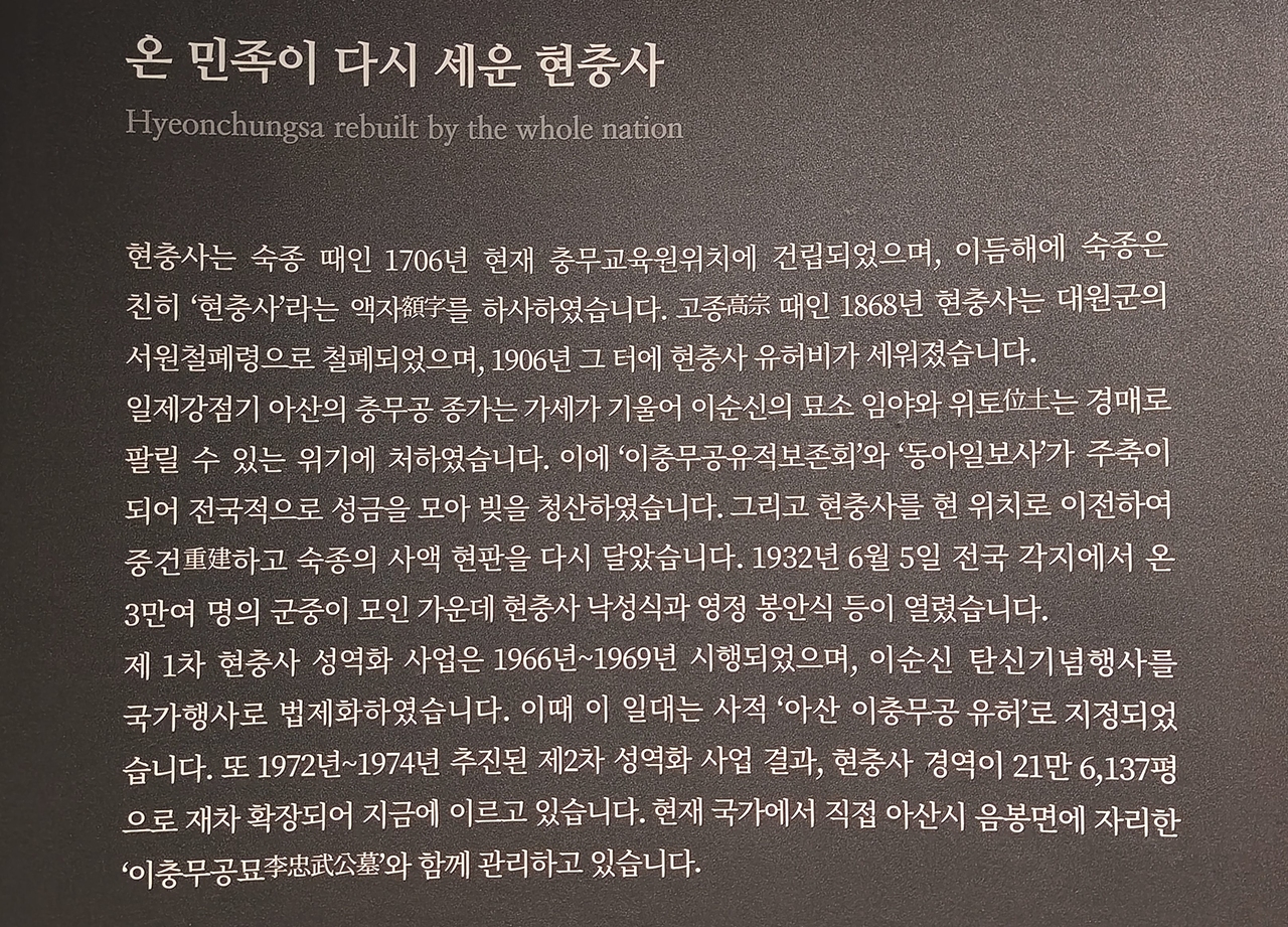 충무공 이순신 기념관은 충청남도 아산시에 위치한 현충사 경내에 있으며 임진왜란 당시 나라를 구한 이순신 장군의 위대한 업적과 애국정신을 기리기 위해 건립된 곳이다 이순신 장군의 위업과 임진왜란 관련 역사 자료 유물들이 전시되고 있다.